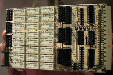 Aus diesen Erkenntnissen entstand ein Entwurf für einen anderen Universal Pin Driver, bei dem entscheidende Schaltvorgänge mit Relais vorgenommen wurden. Der Aufwand ist erheblich, bietet aber einige Vorzüge. Die hier ohne "daughther board" dargestellte Platine steuert 8 Pins an, wovon jeder unabhängig auf Masse, eine von vier Programmier- oder Versorgungsspannungen oder einen CMOS-/TTL-Ausgang geschaltet werden kann. Der TTL-Ausgang beherrscht die Modi push-pull und open collector (theoretisch auch open emitter, was mir bisher in der Praxis jedoch nicht begegnet ist), wobei unabhängig davon pull-up-Widerstände zugeschaltet werden können. Der Ausgangstreiber wird über einen Multiplexer entweder mit log.0, log.1 oder einem von zwei möglichen Takt- oder Steuersignalen beaufschlagt. Die TTL-Leitungen verfügen über schnelle Schottky-Dioden als Überspannungsschutz gegen Masse und die Versorgungsspannung der Treiber, die im Übrigen zwischen 2.5 und 6V gewählt werden kann. Neben dieser Platine vom Herbst 1998 existiert noch ein Versuchsaufbau eines Netzteils, das die interne Logik sowie die Treiberschaltkreise versorgen und letztere auch überwachen kann, es sollten programmierbare Schaltschwellen für maximalen Ausgangsstrom sowie eine Erkennung von aussen eingespeister Ströme, z.B. durch einen defekten Baustein im Programmiersockel, realisiert werden. Die Planung ging dahin, 8 dieser Baugruppen mit dem bereits fast fertig gestellten Netzteil, zwei PLL-basierten programmierbaren Taktgeneratoren und vier programmierbaren geregelten Netzteilen in zwei 19"-Baugruppenträgern zu montieren. Das bereits an diesem Punkt anspruchsvolle Pflichtenheft wurde weiter ergänzt durch besondere Wünsche die Taktgeneratoren betreffend, so sollten z.B zwei gegenphasige Signale generiert werden können; ferner sollten die vier Netzteil-Module im Bereich von 0 bis 30 Volt bei umkehrbarer Polarität programmierbar sein, über eine einstellbare Strombegrenzung verfügen sowie bei Erreichen einer vorher festzulegenden Überspannungsschwelle sofort abschalten, um ein eventuell nicht ersetzbares Bauteil vor Beschädigung zu schützen. Ferner sollten Anstiegs- und Abfallzeiten programmierbar sein, was für die reproduzierbare Verarbeitung bestimmter PROM-Typen unumgänglich ist. Um schliesslich weitergehende Messungen am zu programmierenden Baustein durchzuführen, verfügt die Pin-Driver-Karte über einen kaskadierbaren Analog-Multiplexer.