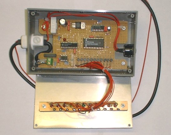 Zur Diagnose einer Störung der Gemischaufbereitung oder einfach nur aus Freude an flackernden Lichtern kann dieses Bargraph-Voltmeter verwendet werden. Der Messbereich ist speziell auf den Spannungsbereich der meisten Lambdasonden von 0-1V ausgelegt. Besondere Aufmerksamkeit galt der hochohmigen Ankopplung an die Sonde und dem Schutz der Schaltung gegen die im Kfz-Bordnetz vorhandenen Transienten. Ungewöhnlich ist die Digitalisierung des verstärkten Analogsignals: da kein geeigneter LED-Treiber zur Verfügung stand, habe ich einen vorhandenen A/D-Wandler (ADC0804) mit einem 4-zu-16-Demultiplexer (74LS154) kombiniert. Auf dem Foto ist das geöffnete Gerät zu sehen; die Platine auf der Innenseite der Frontplatte ist mit 11 Leuchtdioden bestückt, die in drei Farben den Bereich von 0-1V abdecken; überschreitet die Eingangsspannung 1V, so blinkt die 11. LED.