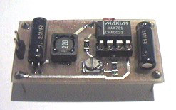Auf den ersten Blick ein gewöhnlicher Step-Up-Regler, um die Solarzellenspannung zur Ladung der Geräteakkus anzuheben. Der Fehlerverstärker des Maxim MAX761 wurde aber um einen CMOS-Operationsverstärker nebst Beschaltung (auf der Unterseite der Platine) ergänzt, so dass nicht Ausgangsspannung oder -strom, sondern die Belastung der Solarzelle geregelt wird, so dass diese durch die erfolgte Leistungsanpassung immer in ihrem optimalen Arbeitsbereich betrieben wird. Zur Anpassung an die jeweilige Zelle dient das SMD-Potentiometer.