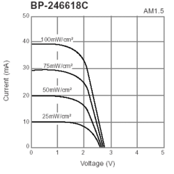 aus: Panasonic Solar Cells Technical Handbook '98/99 - Diese Kennlinie zeigt nun deutlich, dass der optimale Arbeitspunkt relativ unabhängig von der einfallenenden Lichtmenge ist. Diesen Umstand macht sich die Schaltung nun zu Nutze, indem sie die Ausgangsspannung -dies übernimmt der im MAX761 enthaltene Fehlerverstärker- auf ca. 5.7V regelt, während der extern hinzugefügte Verstärker die Spannung an der Solarzelle auf etwa 2V hält. Mit dem Ausgangsstrom kann dann ein Akku geladen werden, wofür diese Schaltung im Rahmen eines grösseren Projektes letztlich auch entwickelt wurde. Damit in Zeiten starker Sonneneinstrahlung in Kombination mit niedrigem Leistungsbedarf des angeschlossenen Gerätes der Akku nicht überladen wird, wurde ein Enable-Eingang vorgesehen, über den der auch sonst für den Ladevorgang zuständige Microcontroller das Sonnetanken unterbrechen kann.