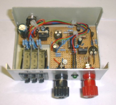 Wie gewohnt schien auch während der Entwicklung des Ladereglers die Sonne nicht, so dass die Solarzelle simuliert werden musste. Das gezeigte Gerät besteht aus einer steuerbaren Stromquelle sowie einem parallel zu den Ausgangsklemmen liegenden, ebenfalls einstellbaren Shunt-Regler. Während durch erstere mittels zweier Kodierschalter der Kurzschlussstrom der Zelle vorgegeben werden kann, bestimmt letzterer, ebenfalls mit Hilfe eines Kodierschalters wählbar, die Leerlaufspannung.